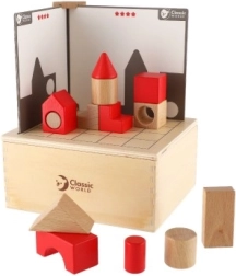 Zestaw jest przeznaczony dla dzieci od 3 lat, a wszystkie elementy są bezpiecznie przechowywane w drewnianym pudełku o wymiarach 18,5 x 16 x 9 cm. Dzieci mogą próbować składać klocki według kart i dopasowywać obie strony, ćwicząc w ten sposób logikę i zręczność.