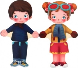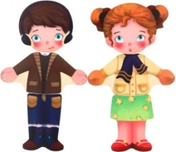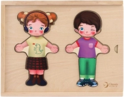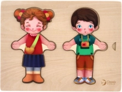 Drewniana deska z postaciami chłopca i dziewczynki pomaga rozwijać małą motorykę i logiczne myślenie.