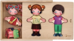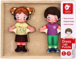 Odkryj zabawny świat mody z Drewnianą układanką Ubieranie! Ten zestaw zabawkowy zawiera 26 elementów, które umożliwiają ubieranie postaci chłopca i dziewczynki według własnej wyobraźni. Każdy element jest zaprojektowany tak, aby stymulować dzieci do twórczej zabawy i rozwoju ich estetycznego poczucia.