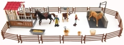 - Wybieg z ogrodzeniem, 2 figurki koni, opiekunowie, akcesoria do pielęgnacji (siodła, karmienie, akcesoria do czyszczenia i prysznica)