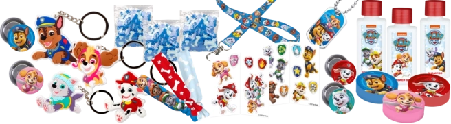 - 3 opaski, 1 brelok, 4 zawieszki, 4 odznaki, 4 psie identyfikatory, 1 balsam do ciała, 1 żel pod prysznic, 2 zestawy naklejek, 3 paczki konfetti, 3 musujące kule