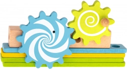 Kolorowe koła zębate i elementy konstrukcyjne przybliżają zasady mechaniki w przystępny, zabawowy sposób i wspierają kreatywność.