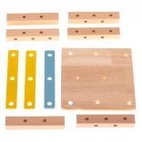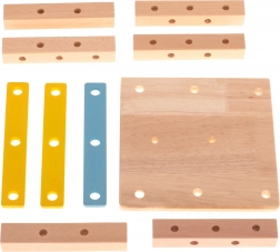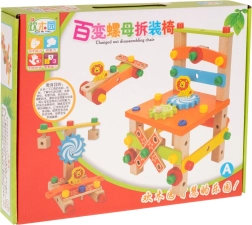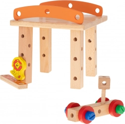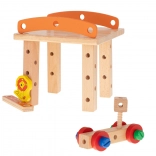 Ten wysokiej jakości drewniany zestaw umożliwia dzieciom zbudowanie stołeczka warsztatowego oraz innych oryginalnych modeli. Dzięki śrubkom, nakrętkom i kółkom zębatym dzieci poznają podstawy prostej mechaniki, trenują koncentrację i zręczność. Stołeczek jest stabilny, a przemyślany system otworów i połączeń oferuje wiele kombinacji.