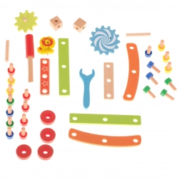 W komplecie znajduje się drewniany śrubokręt i klucz, więc mali konstruktorzy mają wszystko, czego potrzebują. Wielobarwne elementy z wesołymi motywami (np. lew i koła zębate) wspierają twórczą zabawę i uczą rozpoznawania kolorów. Świetny pomysł na zabawkę edukacyjną i prezent, który zajmie na długie godziny.