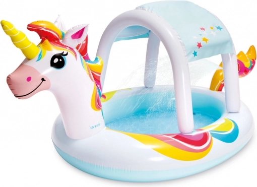 Uroczy dmuchany basen w kształcie jednorożca zapewni dzieciom godziny letniej zabawy. Dzięki zintegrowanemu rozpylaczowi wody oraz kolorowej daszkowej osłonie oferuje orzeźwienie i częściowy cień. Wykonany z wysokiej jakości winylu, ma pojemność do 130 l, wymiary 2,54 × 1,32 × 1,09 m i jest odpowiedni dla dzieci od 2 lat. W zestawie znajduje się również łatka naprawcza.