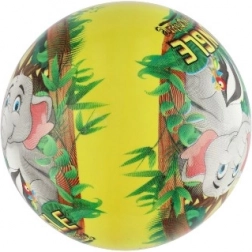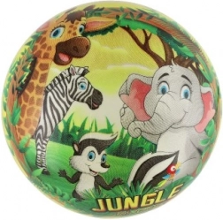 Piłka ma wesoły design z motywem dżungli, który zawiera rysunkowe zwierzęta jak słoń, żyrafa i zebra.