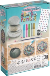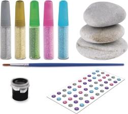 Trzy naturalne, gładkie kamienie, pędzelek, czarna farba, pięć metalicznych odcieni oraz błyszczące kamyczki – zacznij tworzyć od razu po otwarciu.