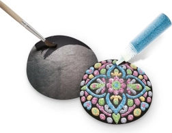 Zawartość zestawu została zaprojektowana tak, aby była odpowiednia dla początkujących i małych artystów. Gładkie kamienie dobrze leżą w dłoni, pędzelek pozwala na precyzyjną pracę, a metaliczna paleta (niebieska, różowa, zielona, srebrna i złota) nadaje każdemu motywowi elegancki wygląd. Kreatywność nie zna granic – od mandali, przez buźki, aż po własne ornamenty.