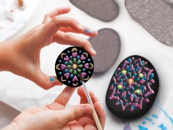 Z tym twórczym zestawem z łatwością stworzysz efektowne mandalowe wzory i lśniące motywy na gładkich kamieniach. Dzięki połączeniu czarnego tła, metalicznych farb i samoprzylepnych kamyczków Twoje dekoracje wyróżnią się wyrazistym kontrastem i blaskiem. Malowanie na kamieniach to świetny sposób, by odpocząć, a jednocześnie przygotować piękne prezenty lub dodatki do domu i ogrodu.
