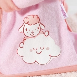 Pajacyk ma oryginalny nadruk owieczki na chmurce, która korzysta z tęczowego prysznica.