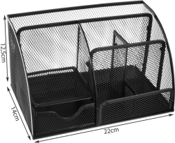 Ten praktyczny organizer pomoże zorganizować wszystkie Twoje akcesoria biurowe i utrzymać blat w porządku. Solidna konstrukcja z metalu (żelaza) o ażurowym, siatkowym wzorze jest odporna i trwała, dzięki czemu wytrzyma codzienne użytkowanie w domu i w pracy. Dzięki kompaktowym wymiarom zmieści się na każdym biurku, a mimo to jest zaskakująco pojemny.