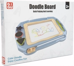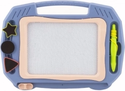 Odkryj zabawny sposób na wspieranie dziecięcej kreatywności – magnetyczna tablica do rysowania w niebieskim kolorze z długopisem na sznurku i trzema magnetycznymi stempelkami (kółko, gwiazdka, trójkąt). Jednym ruchem suwaka łatwo zmażesz obrazek i możesz tworzyć od nowa, bez końca.