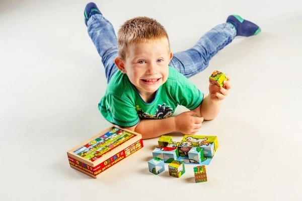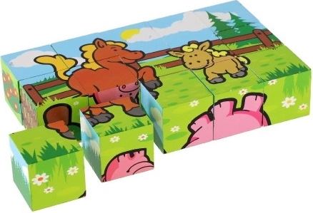Drewniane klocki z kolorowymi obrazkami różnych domowych zwierzątek są doskonałym narzędziem do rozwoju dzieci. Podczas poprawnego ułożenia pojawia się jeden z sześciu obrazków, co wspiera logiczne myślenie i fantazję najmłodszych. Podczas budowy i burzenia wież dzieci uczą się zasady równowagi i podstaw związku przyczynowo-skutkowego.