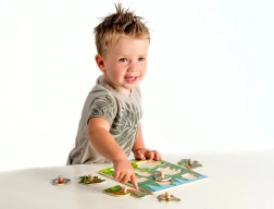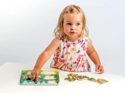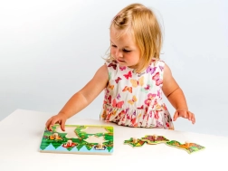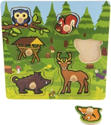 Leśne motywy takie jak sowa, wiewiórka, dzik czy jeleń w przystępny, zabawny sposób zachęcają do odkrywania. Drewniana podkładka z ramkami utrzymuje każdy element na swoim miejscu i ułatwia prawidłowe dopasowanie według kształtu i obrazka.
