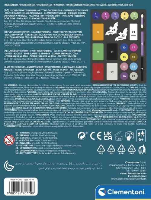 - Paleta cieni do powiek, kredki do ciała, aplikator, gąbeczki, kasetka z lusterkiem