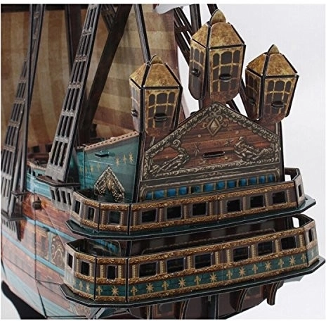 3D puzzle żaglowca San Felipe marki CubicFun oferują realistyczny model historycznej galiony z bogatymi zdobieniami i dopracowanymi detalami pokładu. Elementy z pianki o grubości ok. 3 mm, pokrytej laminowanym zadrukowanym papierem, precyzyjnie do siebie pasują, zapewniając stabilny i atrakcyjny efekt bez użycia kleju czy nożyczek.