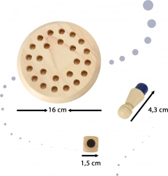 - Zawartość zestawu: okrągła plansza z otworami, 24 drewniane kołeczki w 6 kolorach, drewniana kostka z kolorami