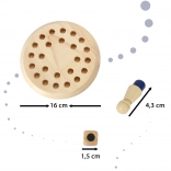 • Zawartość zestawu: okrągła plansza z otworami, 24 drewniane kołeczki w 6 kolorach, drewniana kostka z kolorami