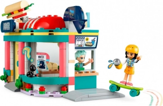 Stwórz własną restaurację z kolorowym zestawem LEGO Friends Bar w centrum Heartlake, który oferuje okienko drive‑thru, zewnętrzne siedzenia, automat do gier i ruchomy jukebox. Dzieci będą się świetnie bawić, przygotowując kanapki z lodówki, obsługując klientów i jeżdżąc na deskorolce – a może wpadnie też w odwiedziny sprytna kotka!