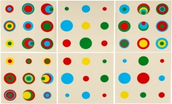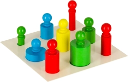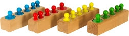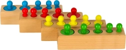 - 4× drewniana podstawka; 5× zielony walec; 5× czerwony walec; 5× niebieski walec; 5× żółty walec