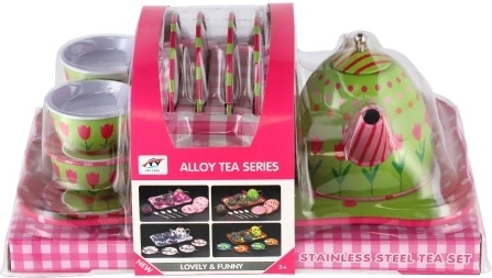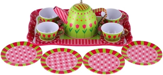 Ten dziecięcy metalowy zestaw do herbaty dostarcza radości z wyimaginowanego serwowania i zabawy towarzyskiej. Zestaw wykonany jest z metalu, dzięki czemu jest solidny, trwały i lekki dla małych rączek. Kolorowe motywy kwiatów, motylków i owoców wspierają kreatywność i wyobraźnię, a taca do serwowania ułatwia przenoszenie i zabawę.