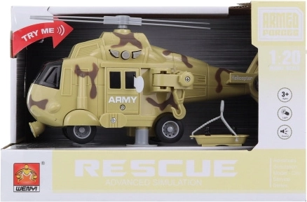 Po naciśnięciu przycisku helikopter wydaje dźwięki i świeci, co znacząco wzbogaca realistyczne wrażenia z zabawy. W zestawie znajdują się także dołączone baterie typu AG13/LR44, które są częścią opakowania.