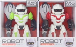 Plastowy robot na baterie z tarczą i pistoletem. Robot chodzi, obraca się, wydaje dźwięki i świeci. Zasilanie na 3 baterie AA (nie dołączone). Wymiary robota ok. 16 × 21 cm. Wymiary opakowania ok. 19,5 × 24 × 9,5 cm. Wiek 3+