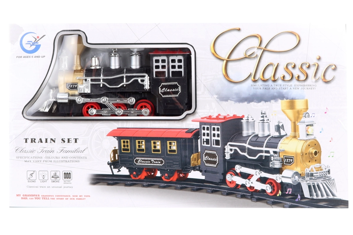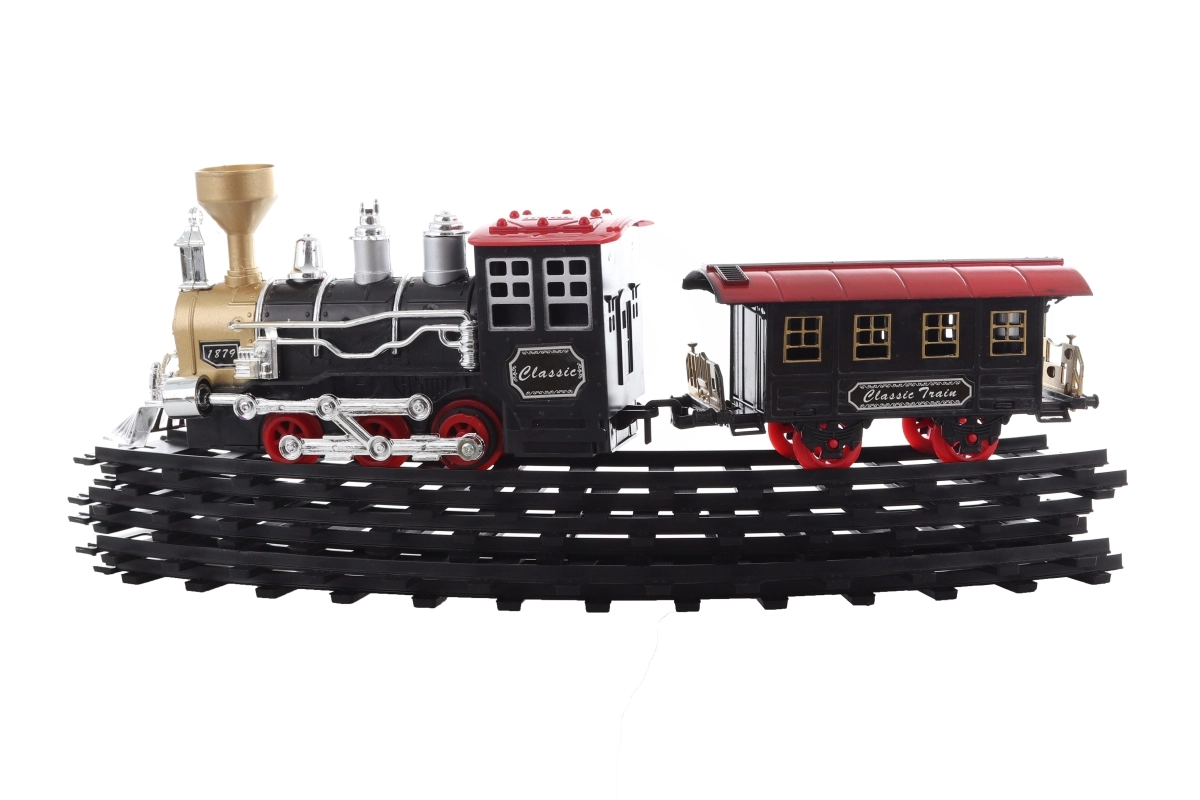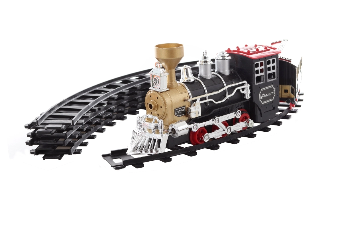 Ta wyjątkowa kolejka oferuje świetną zabawę dla dzieci i miłośników pociągów w każdym wieku. Lokomotywa świeci, wydaje dźwięki i nawet dymi, co zwiększa realizm jazdy. Dzięki dopracowanemu wykonaniu i retro designowi z czarnymi i złotymi akcentami pociąg stanowi doskonałe uzupełnienie domowego torowiska.