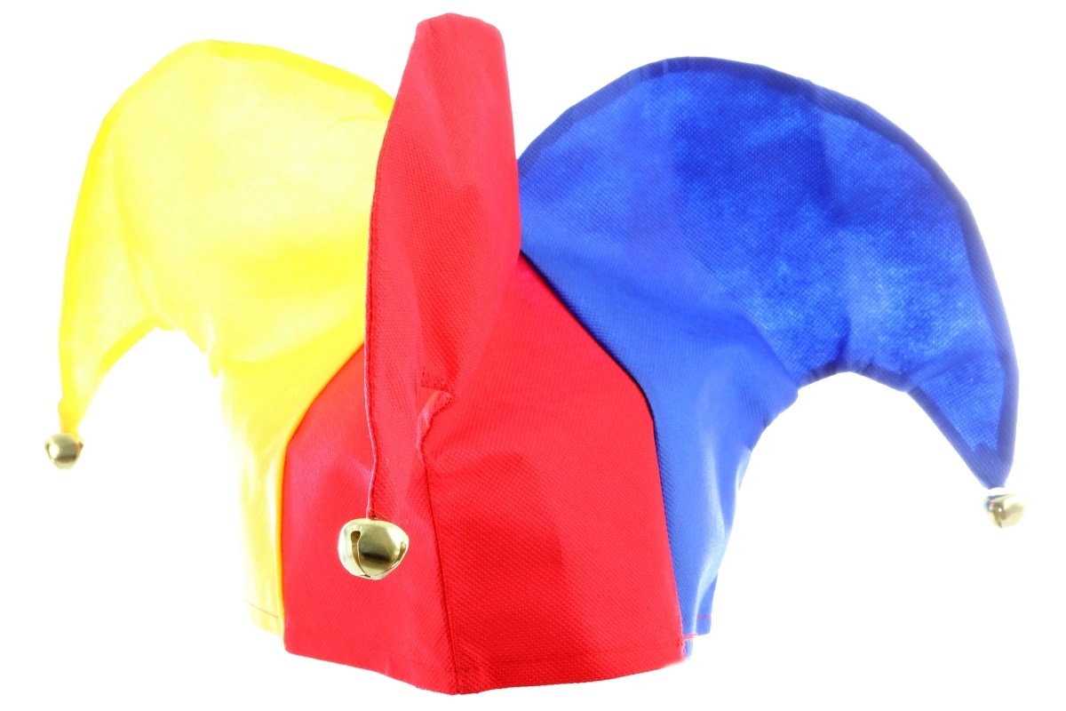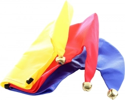 Kolorowa czapka klauna w żółtym, czerwonym i niebieskim kolorze z metalowymi dzwoneczkami dla zabawnego efektu przy każdym ruchu.