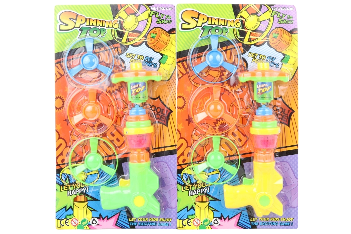 Rozkręć zabawę pistoletem bateryjnym, który wystrzeliwuje wirniki w powietrze i ucieszy każdego małego miłośnika ruchu. Dzięki prostej obsłudze dzieci szybko opanują działanie i będą się cieszyć bezpiecznym lataniem wirników w domu i na zewnątrz. W komplecie także kolorowy bączek dla dodatkowej porcji zabawy.