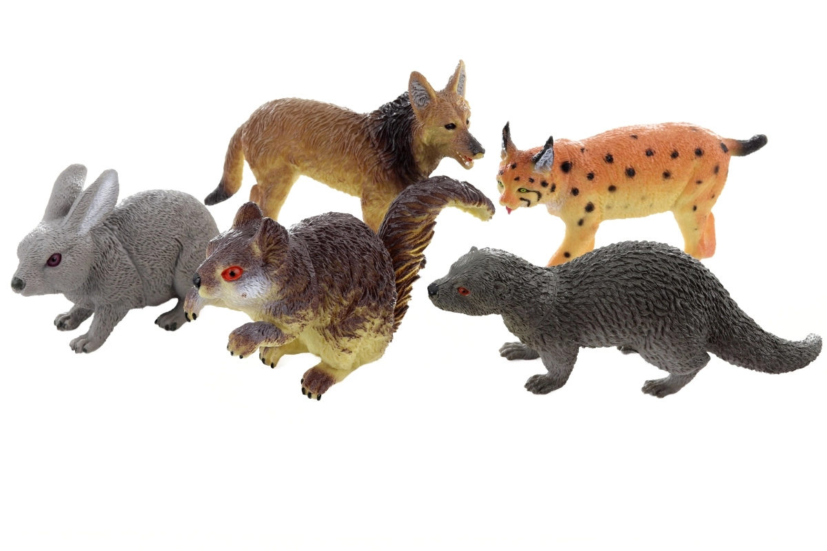 - Zawartość zestawu: wiewiórka, ryś, zając, wilk, wydra