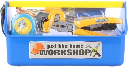 Zestaw narzędzi dla małego majsterkowicza. Opakowanie zawiera wiertarkę, końcówki śrubokrętowe, klucz, szczypce, miarkę i inne akcesoria. Wymiary opakowania około 28 x 15,5 x 13,5 cm. Wiek 3+