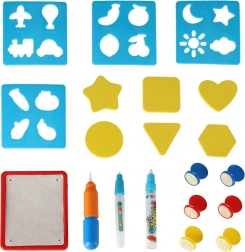 W komplecie znajdują się stemple, szablony, wodne flamastry i pędzelek. Dzieci uczą się kształtów, kolorów i doskonalą małą motorykę.