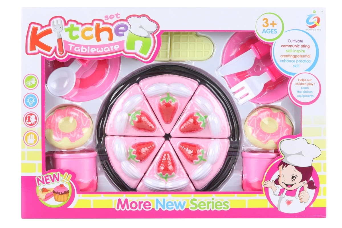 Zabawny plastikowy zestaw dla małych kucharzy zawiera wszystko, co potrzebne do serwowania i krojenia tortu. W środku znajdziesz tort o średnicy ok. 15 cm, 2 kubeczki, 2 talerzyki, babeczki oraz sztućce. Idealny do dziecięcych zabaw w gotowanie i rozwój motoryki małej. Odpowiedni dla dzieci od 3 lat.