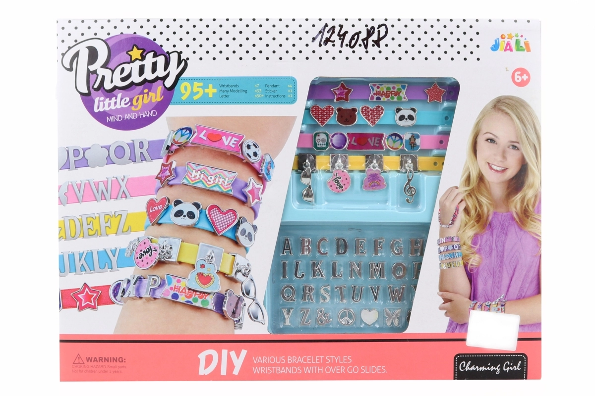 Z tym wszechstronnym zestawem do tworzenia bransoletek dzieci wykonają wyjątkową biżuterię dla siebie i przyjaciół. Łącz kolorowe paski i wstążki, uzupełnij je literkami, aby stworzyć imiona lub wiadomości, a niepowtarzalny wygląd dopełnij naklejkami i innymi ozdobami.