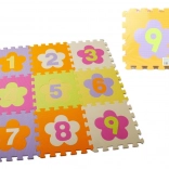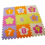 Kolorowe piankowe puzzle z cyframi i wyjmowanymi elementami tworzą miękką i bezpieczną matę do zabawy dla dzieci od 3 lat. Elementy o wymiarach 28 × 28 cm łatwo się łączą, mają ryflowaną, antypoślizgową powierzchnię, są zmywalne, tłumią hałas i izolują od chłodu. Zestaw zawiera 9 kwadratowych elementów.