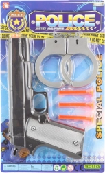 Policyjny zestaw zawiera pistolet, kajdanki i 3 naboje z przyssawką. Wymiary opakowania ok. 31,5 × 19 × 3 cm. Wiek 3+