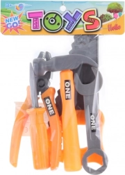 Zabawny dziecięcy zestaw narzędzi dla małych majsterkowiczów od 3 lat. Opakowanie zawiera podstawowe narzędzia do zabawy w naprawy: młotek, klucz, śrubokręt, szczypce i piłkę. Kompaktowe opakowanie w woreczku jest idealne w podróży i w domu.