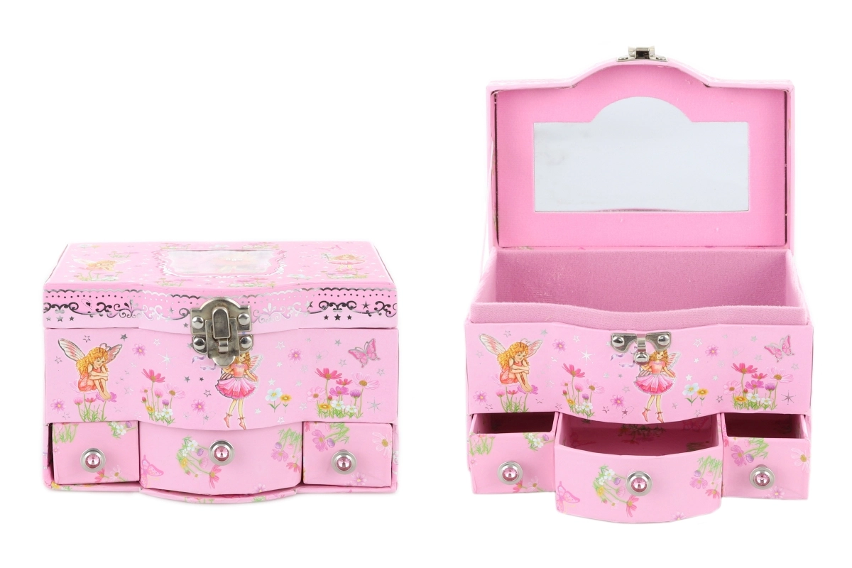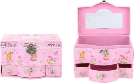 Szkatułka na biżuterię z szufladkami. Wewnątrz wieczka szkatułki znajduje się lusterko, a w dolnej części szkatułki umieszczono 3 praktyczne szufladki. Wymiary szkatułki ok. 17 × 11,5 × 10 cm. Pakowana w woreczek. Wiek 3+