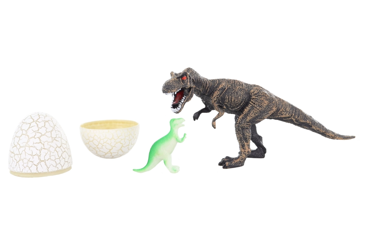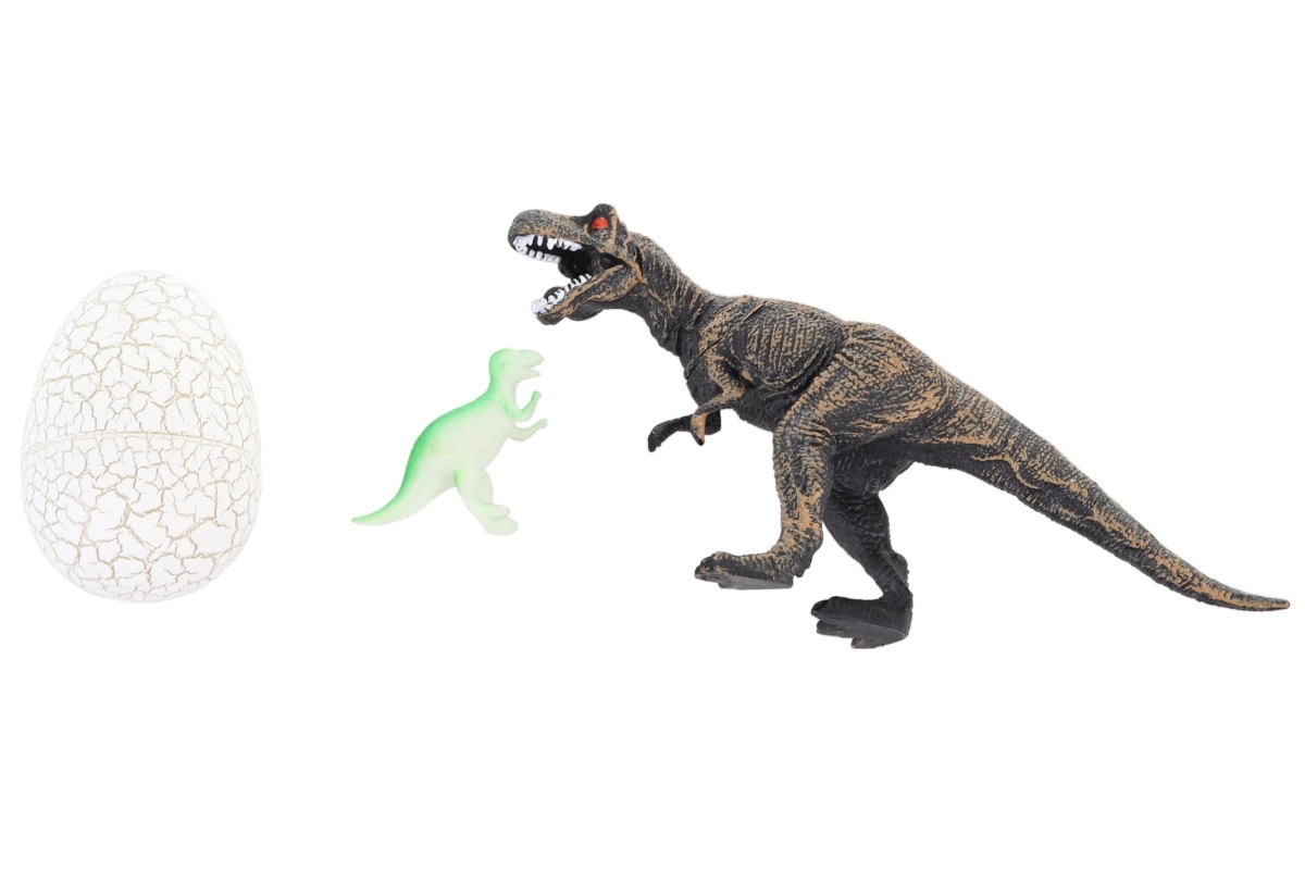 - Figurka dinozaura (T‑Rex) i pęknięte jajko