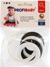 Stylowy zestaw czarno-białych kółeczek z czterema kształtami to idealna pierwsza zabawka dla niemowlęcia. Kontrastowe wzory wspierają stymulację wzrokową, zróżnicowane faktury rozwijają dotyk, a lekkie wykonanie ułatwia chwyt małymi rączkami. Odpowiednie od urodzenia.