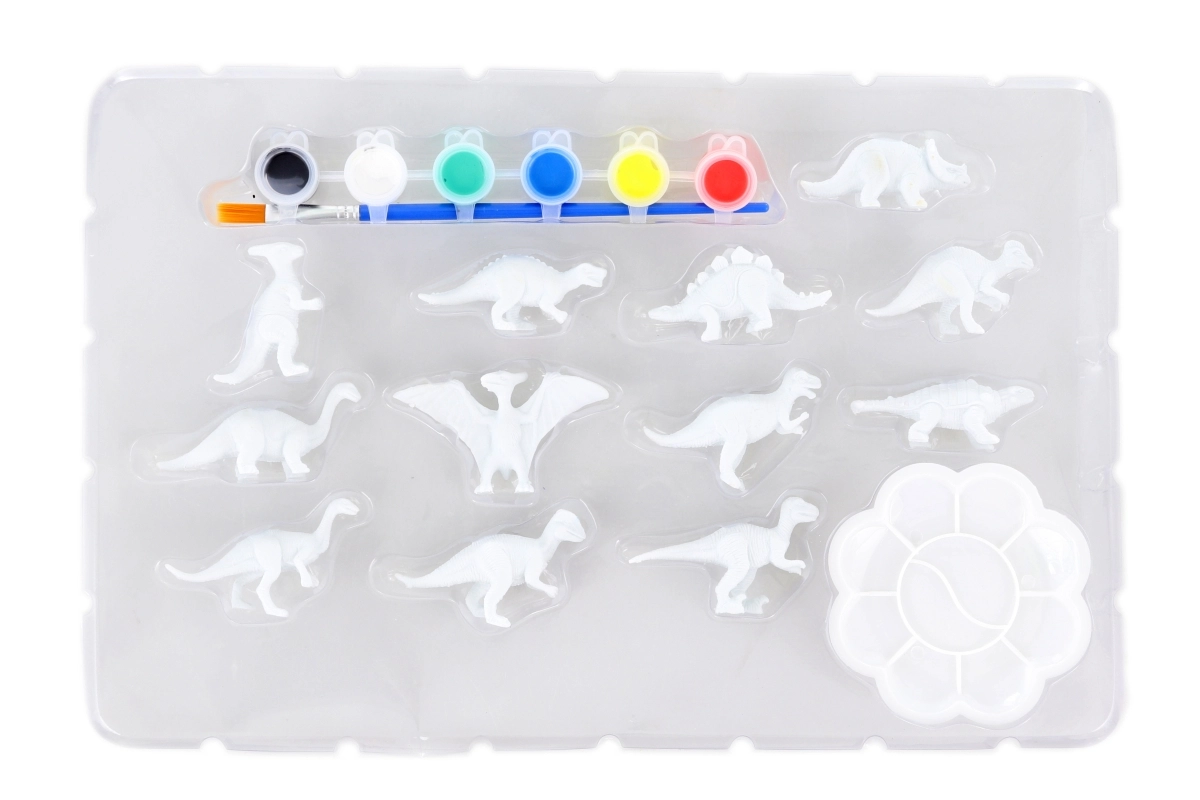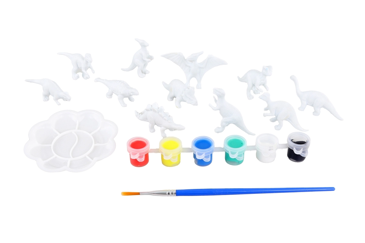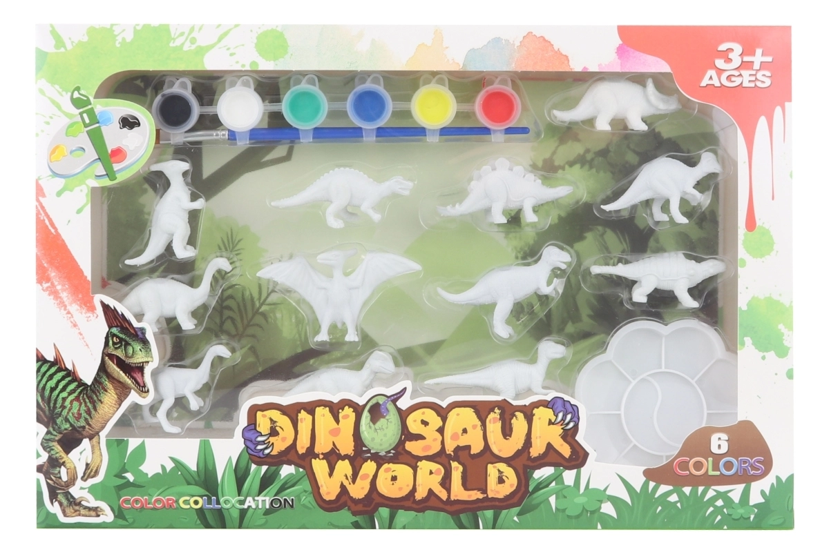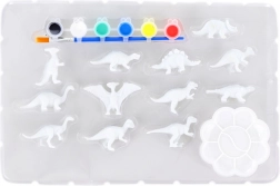 Zestaw zawiera dinozaury 3D, 6 farb, pędzelek i paletę – dzieci mogą zacząć tworzyć od razu, bez dokupywania akcesoriów.
