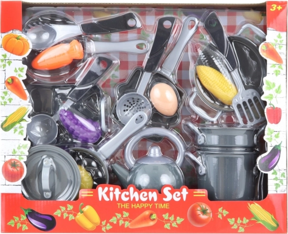 Kompletny dziecięcy zestaw kuchenny dla małych kucharzy zawiera wszystko, czego potrzeba do kreatywnej zabawy. Obejmuje rondel z pokrywką, garnek z durszlakiem, czajnik, brytfannę, patelnie, wok oraz inne akcesoria i produkty spożywcze. Idealny dla dzieci od 3 lat. Wspiera rozwój wyobraźni, zabawy w odgrywanie ról i motorykę małą.