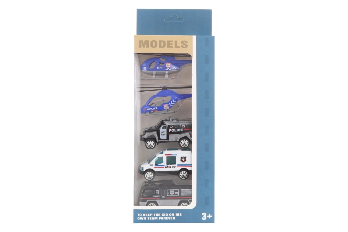 • Kompletny policyjny zestaw – 3 auta i 2 helikoptery w jednym opakowaniu.