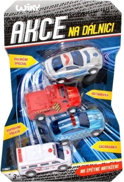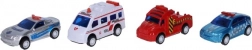 Zestaw czterech samochodzików z funkcją napędu wstecznego dla zabawy na 'autostradzie'. Długość każdego samochodzika to 7 cm. Idealny prezent dla małych entuzjastów samochodów i zabawy.