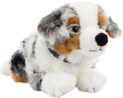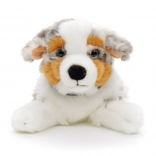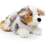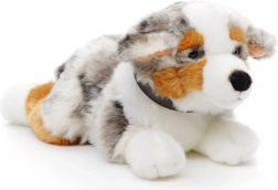Uroczy pluszowy piesek rasy owczarek australijski w pozycji leżącej ucieszy dzieci i miłośników zwierząt. Jest miękki, puszysty i dzięki wykonaniu eco-friendly przyjazny dla środowiska. Idealny do przytulania, zabawy oraz jako dekoracja do pokoju dziecięcego.