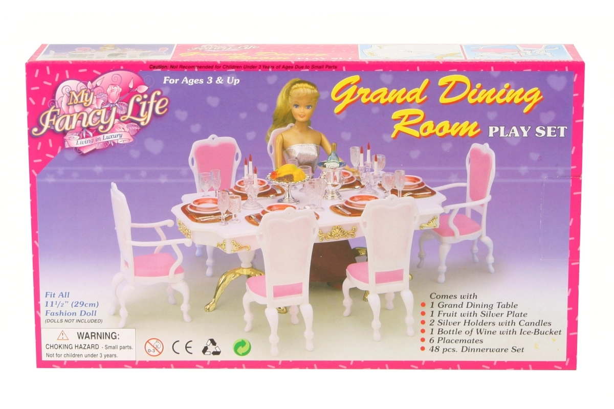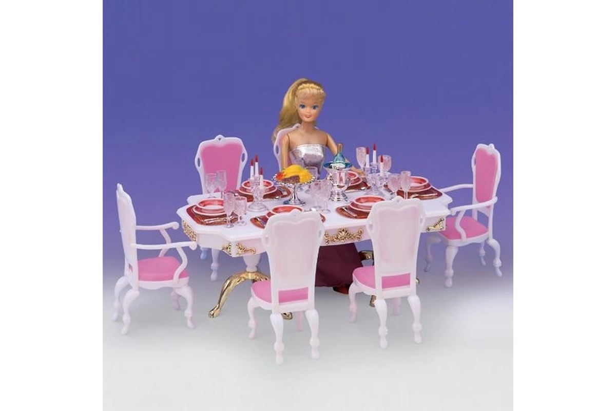 Stylowy zestaw Glorie do lalkowego biesiadowania zamieni każdy pokoik w elegancką jadalnię. Zawiera duży plastikowy stół, 6 krzeseł (2 z podłokietnikami) oraz bogate nakrycie stołu, w tym kieliszki, talerze i sztućce. Idealny do kreatywnej zabawy dla dzieci od 3 lat.