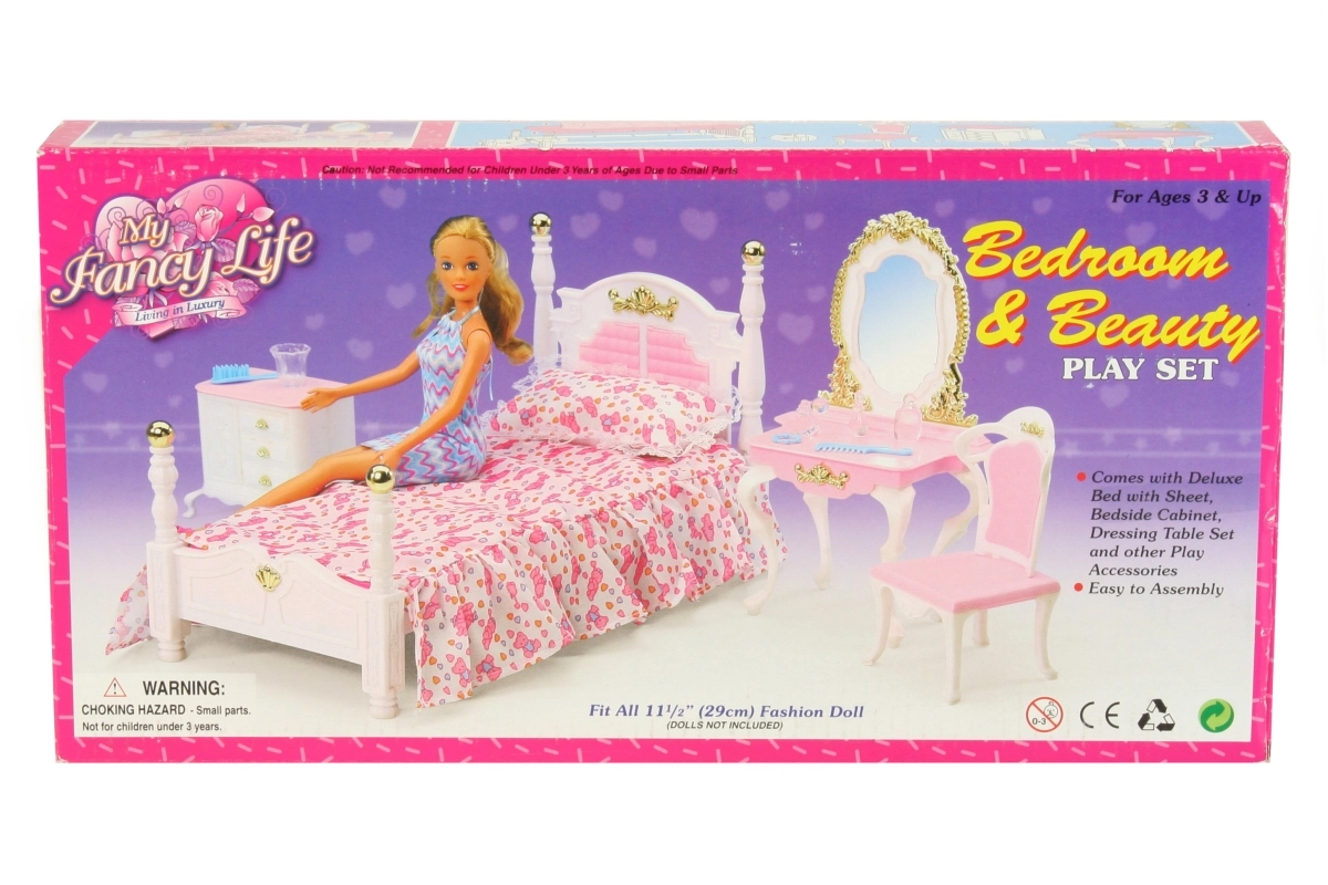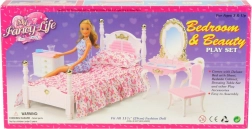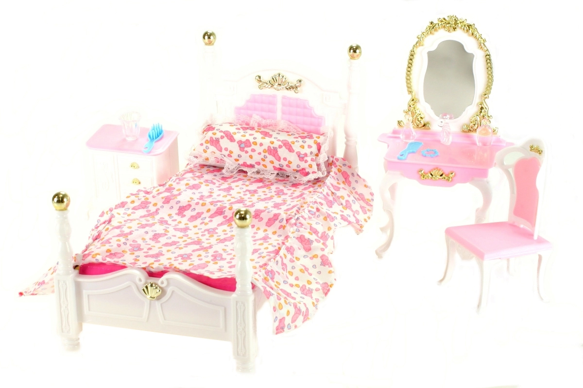 Glorie Sypialnia zawiera plastikowe łóżko o wymiarach ok. 16 cm x 34 cm x 18 cm z narzutą i poduszką, toaletkę o wymiarach ok. 13 cm x 8 cm x 22 cm z akcesoriami dla lalek – grzebień, bransoletka, szczotka i buteleczki, fotel ok. 7 cm x 7 cm x 13 cm, stolik nocny ok. 8,5 cm x 6 cm x 8 cm. Lalka nie jest częścią zestawu. Wiek 3+