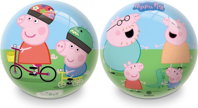 Piłka ozdobiona kolorowymi ilustracjami z bajki Świnka Peppa, które przynoszą radość i zabawę.