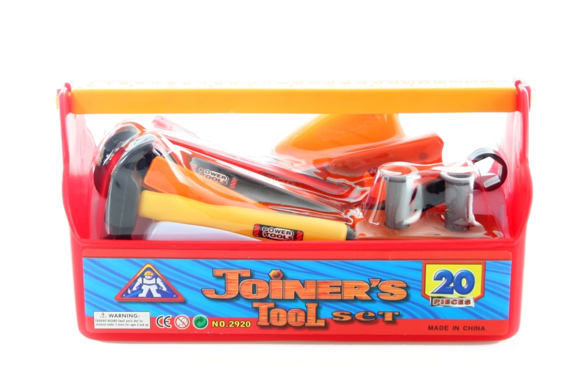 - Zawartość zestawu: młoteczek, nożyk (plastikowy), śrubokręt, klucz nastawny, piłka, linijka, szczypce i śruby